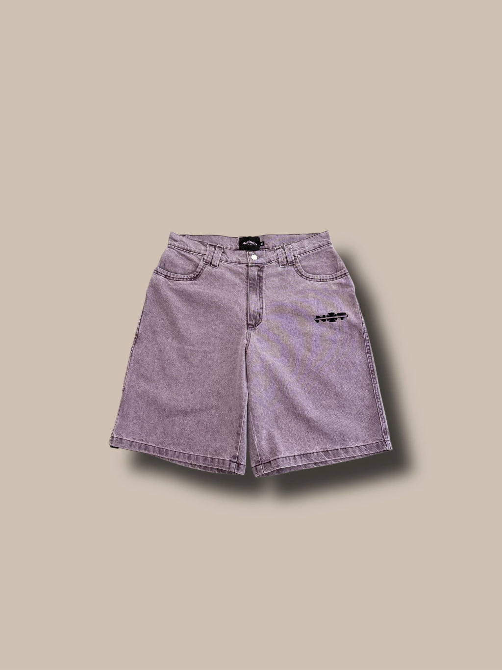 Bermuda de jean desgastada, corte baggy. Detalles bordados y etiqueta de gamuza con forma de cruz.