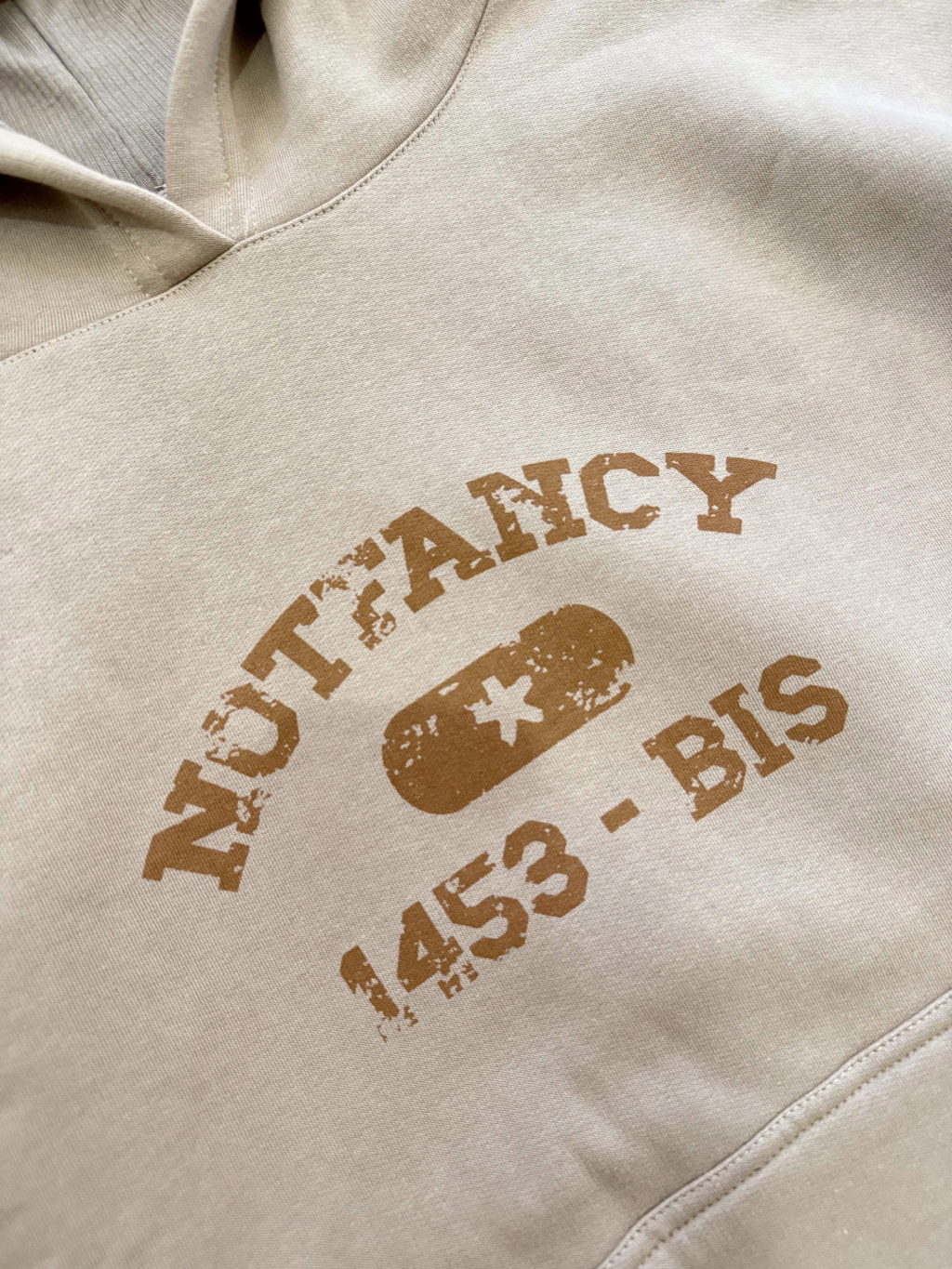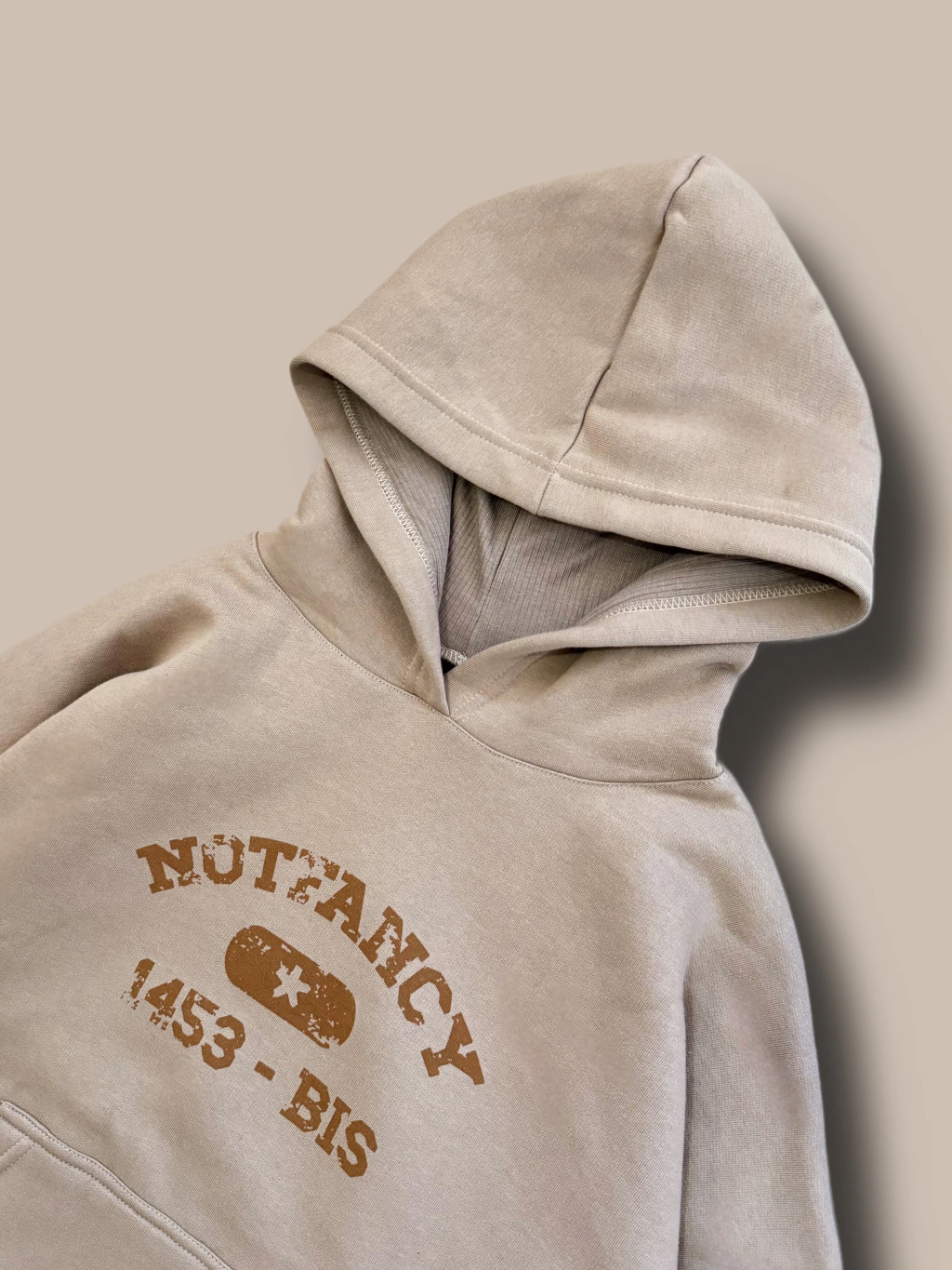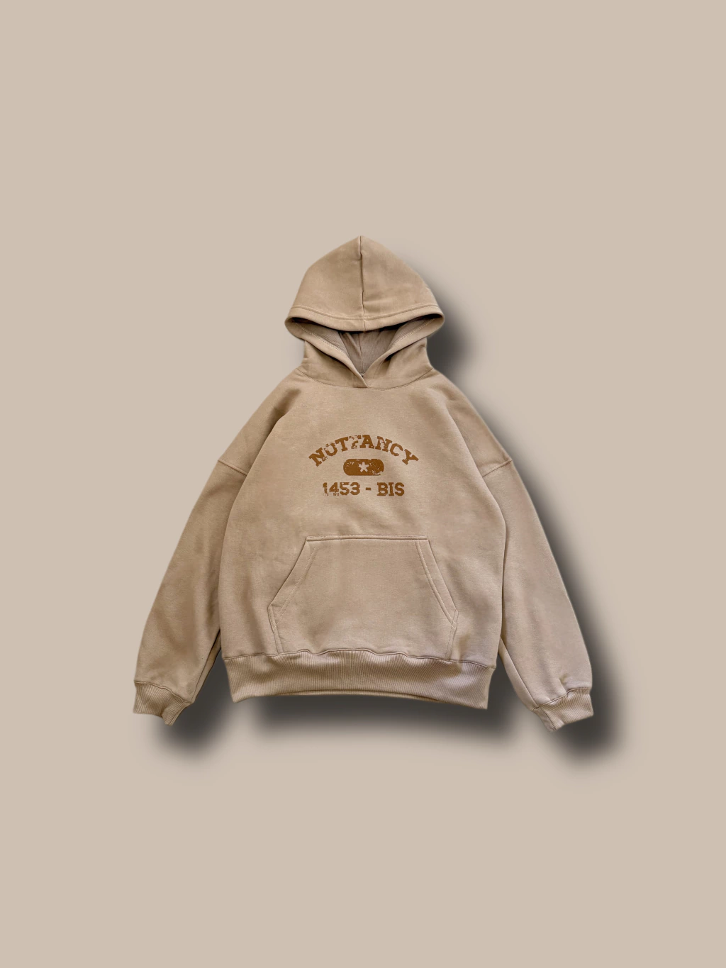Buzo de friza de algodón peinado beige con estampa en marrón. Corte regular suelto, capucha grande. Terminaciones en pespunte, espalda lisa. Recomendamos un talle más si se quiere usar oversize.