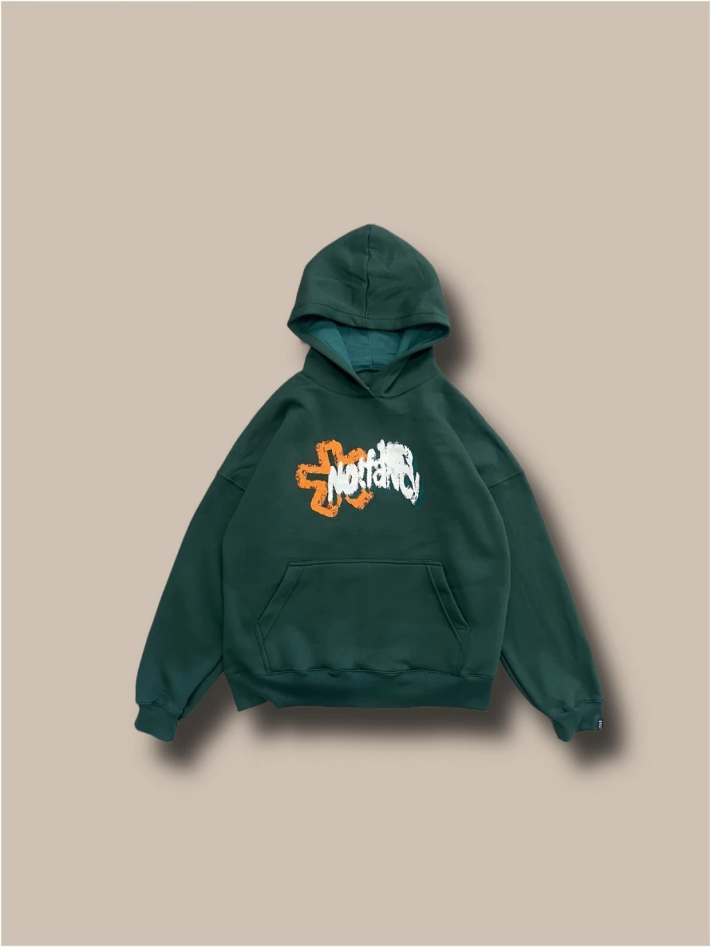 Buzo de friza de algodón peinado color verde con estampado en serigrafia a 3 colores. Capucha bien grande, terminaciones en pespunte, espalda lisa.