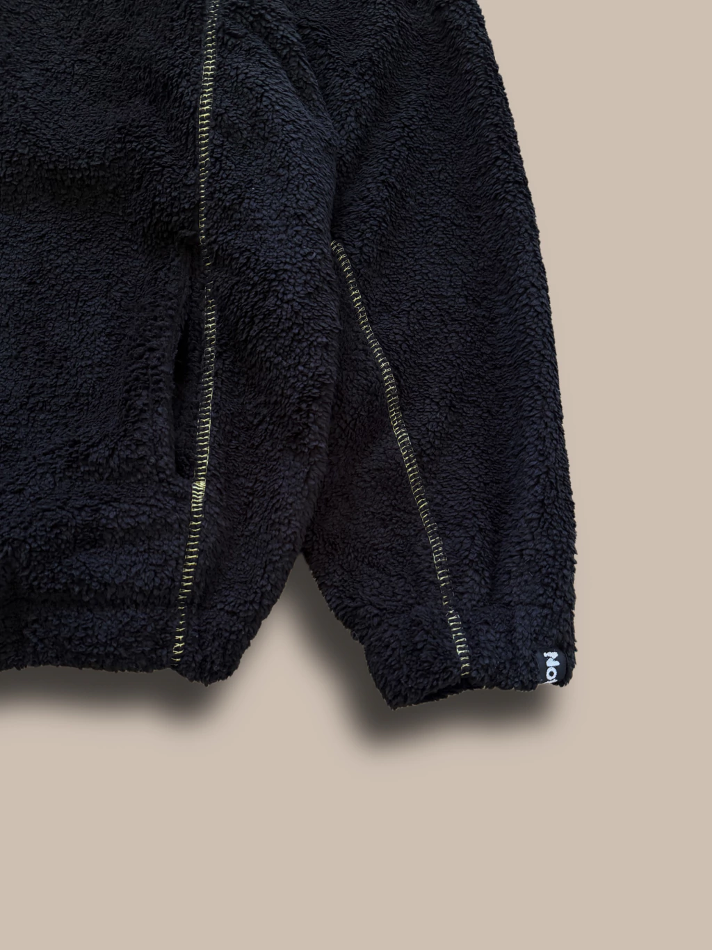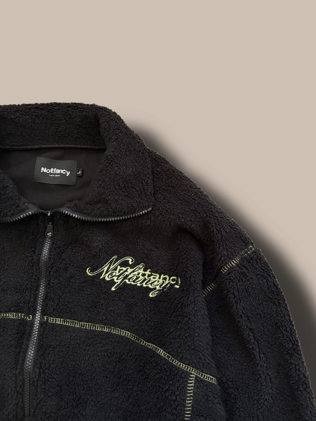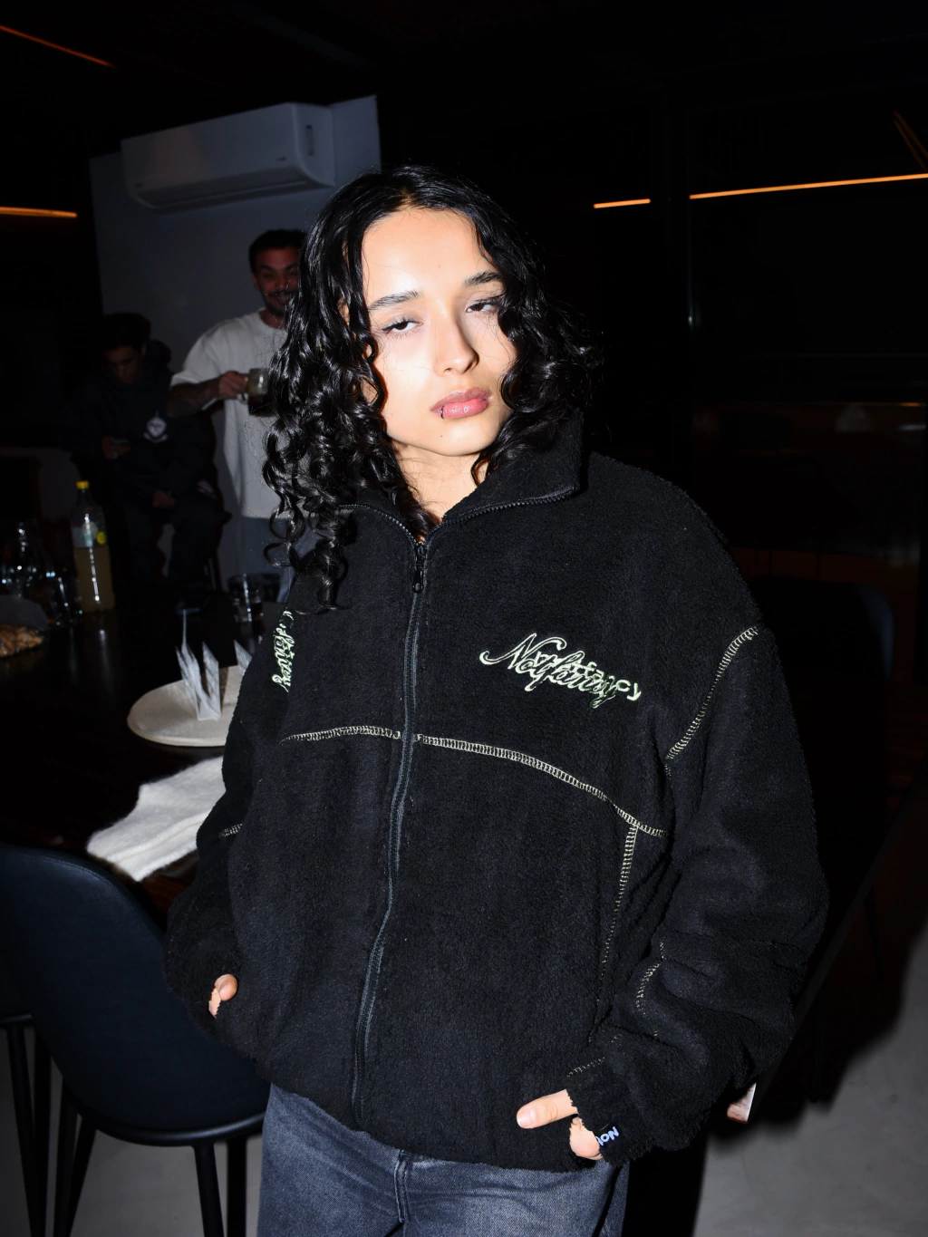 Campera con tela de polar con corderito. Detalles de costuras y bordados en color verde. Abrigada con cierre hasta arriba del cuello por si el fresco excede a la facha. Elasticos en puño y cintura.