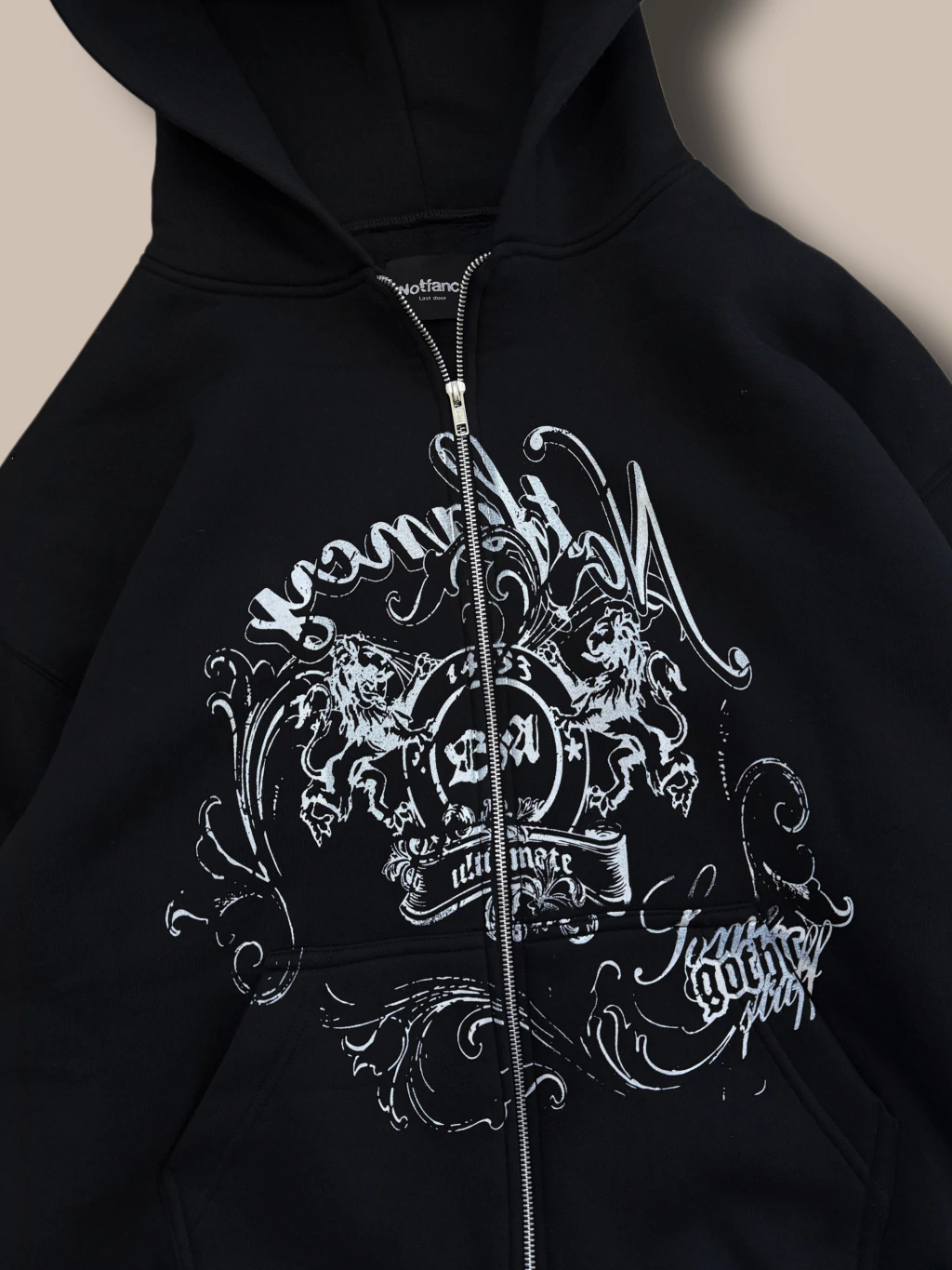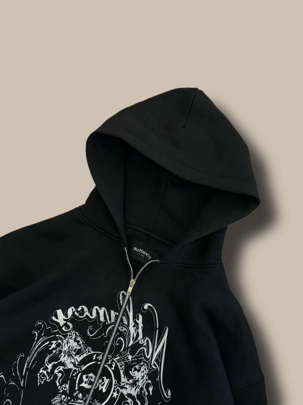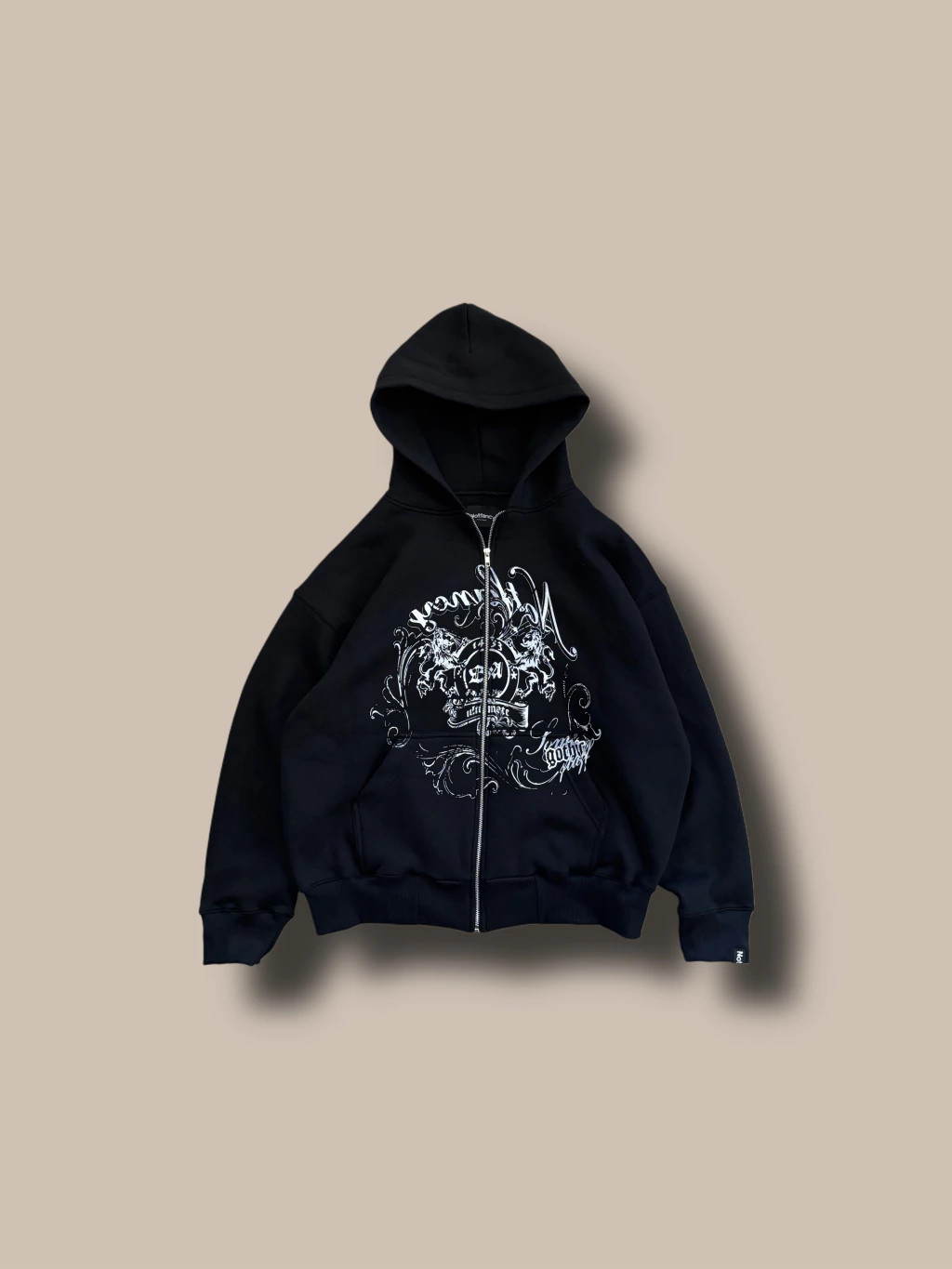 Campera de friza pesada. Negra con estampa en todo el frente, espalda lisa. Corte oversize, capucha bien grande, cierres YKK.