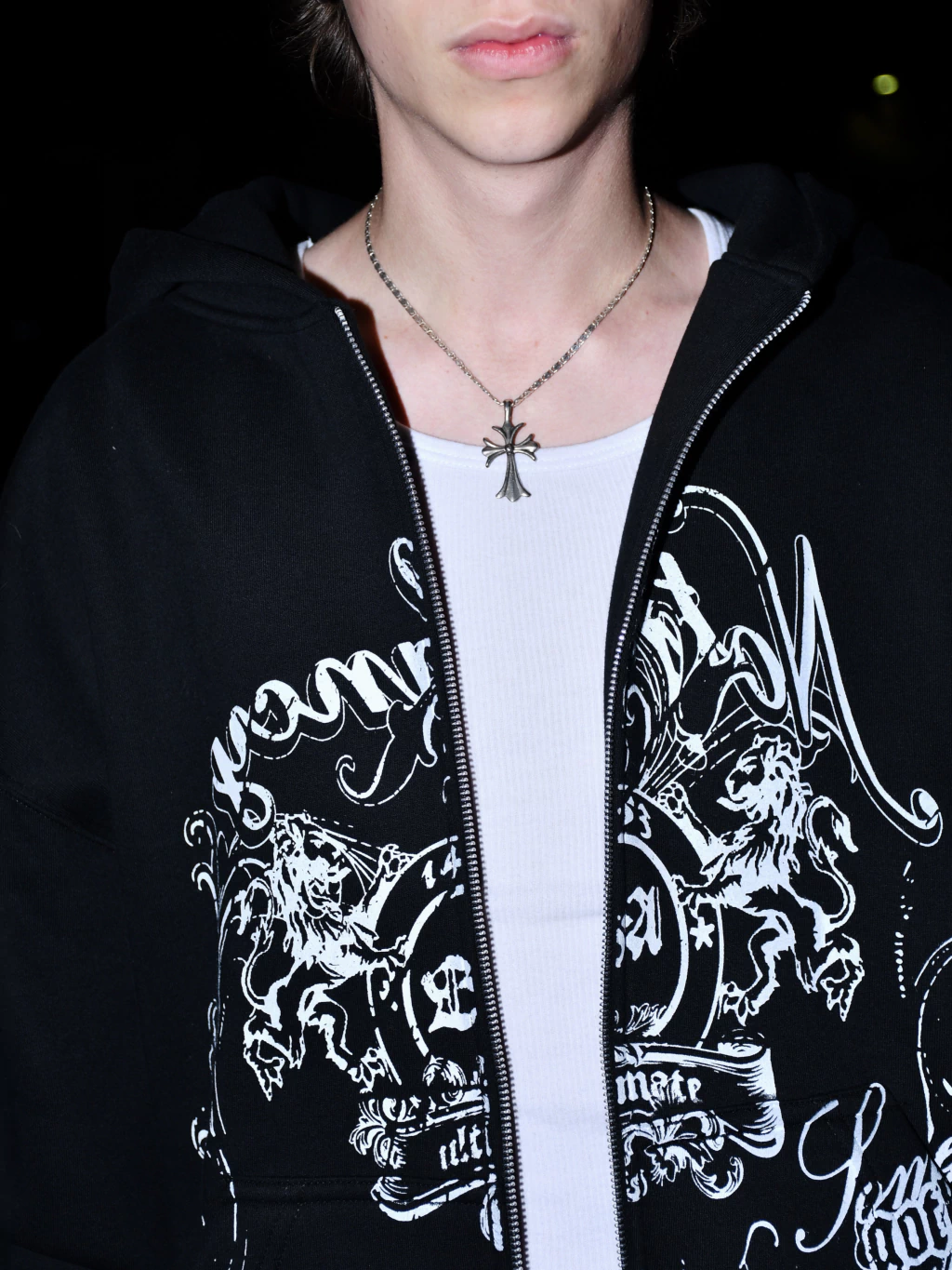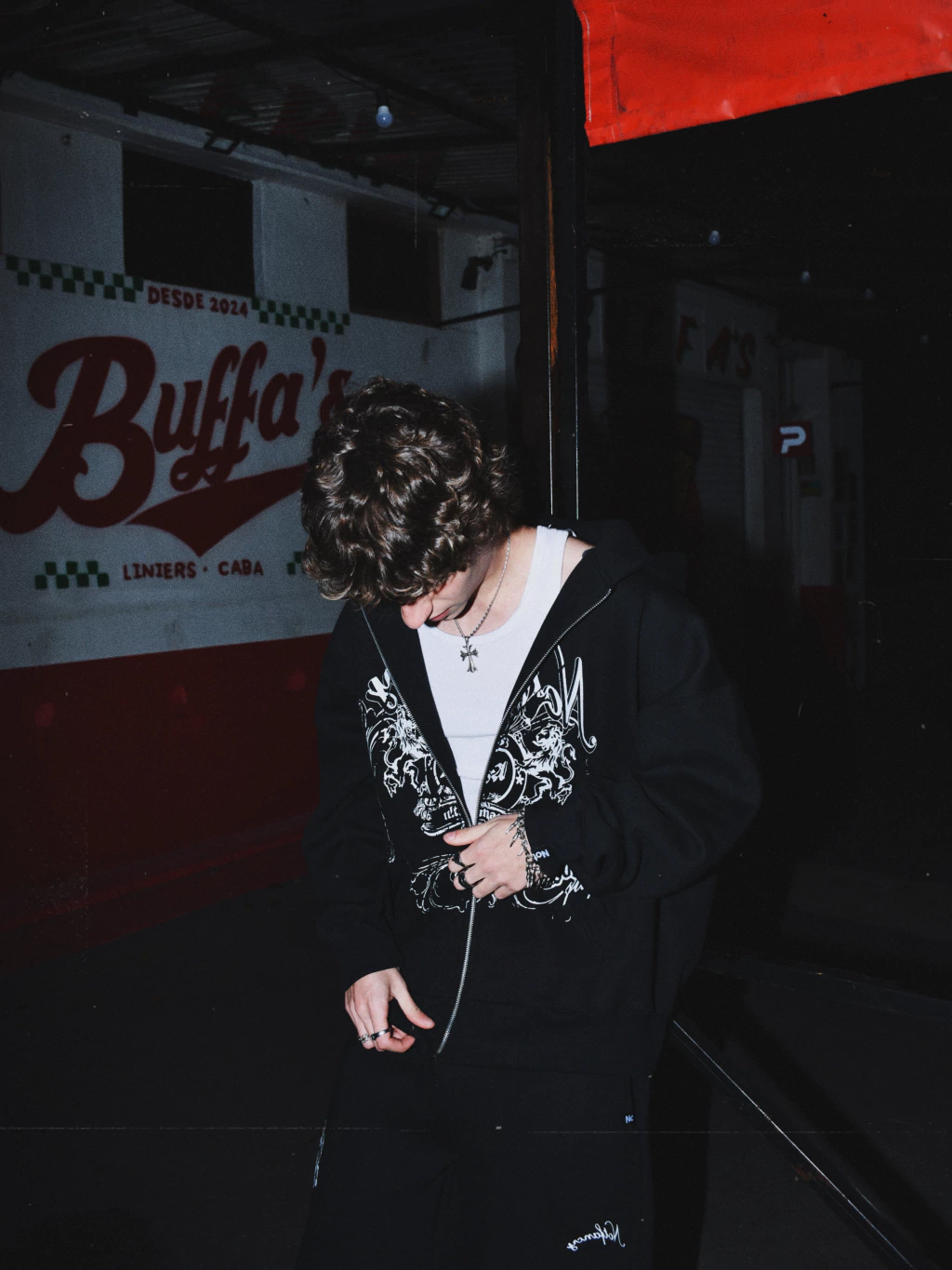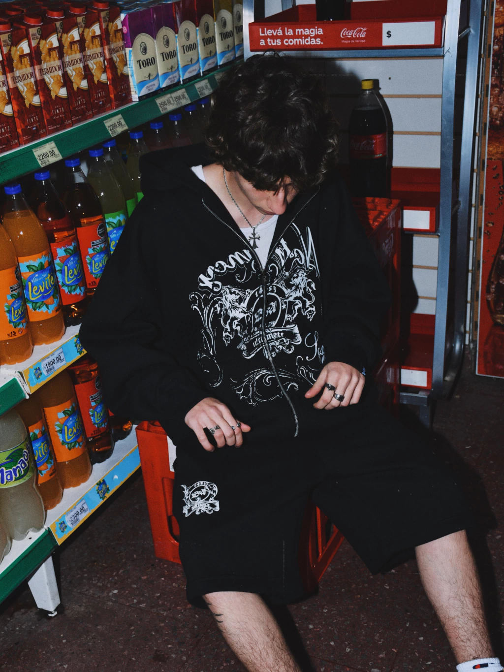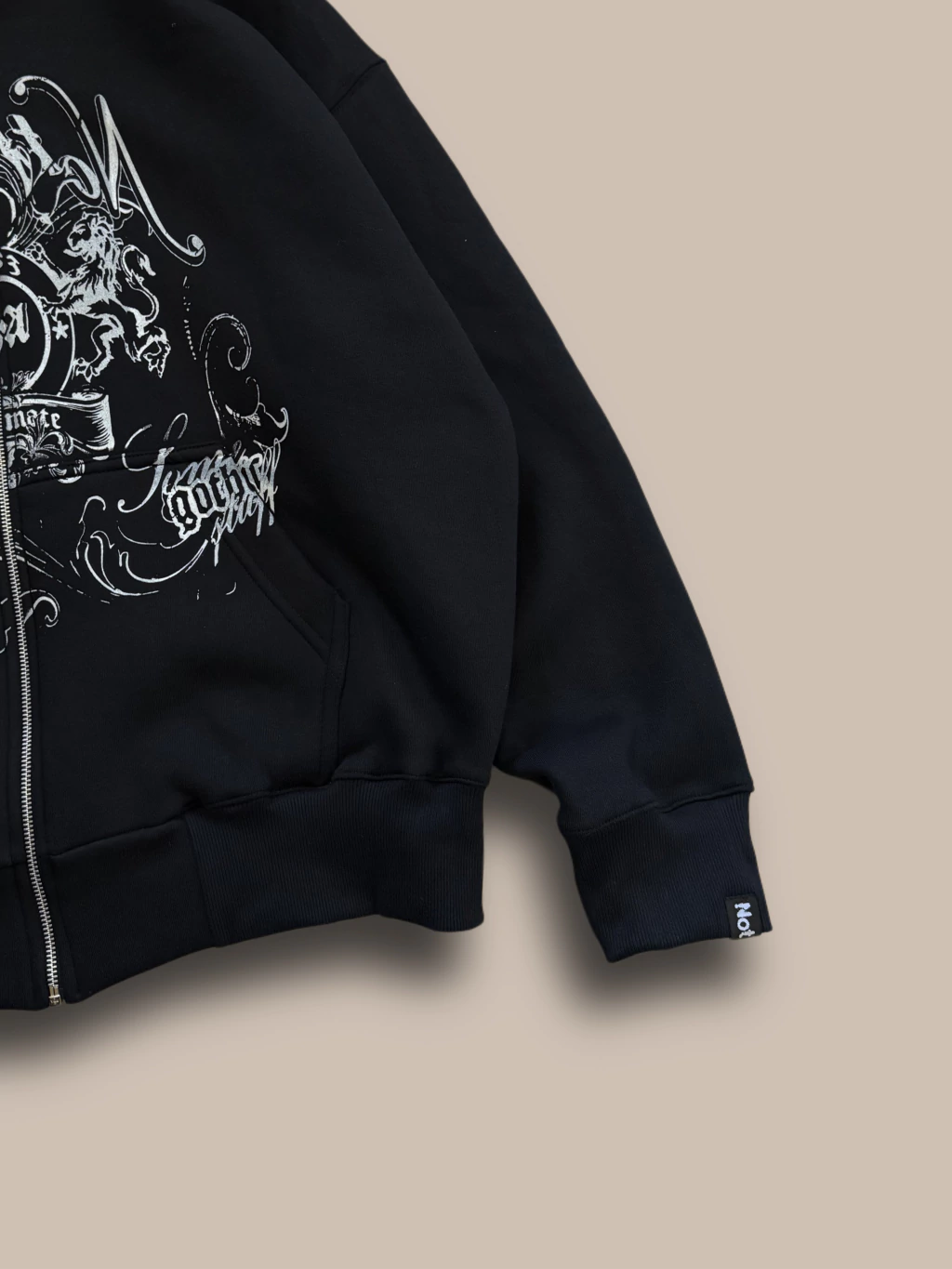 Campera de friza pesada. Negra con estampa en todo el frente, espalda lisa. Corte oversize, capucha bien grande, cierres YKK.