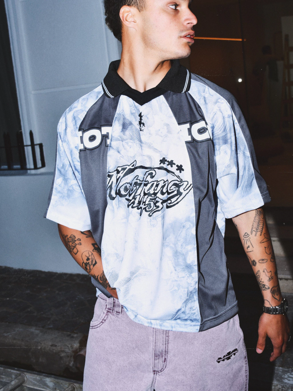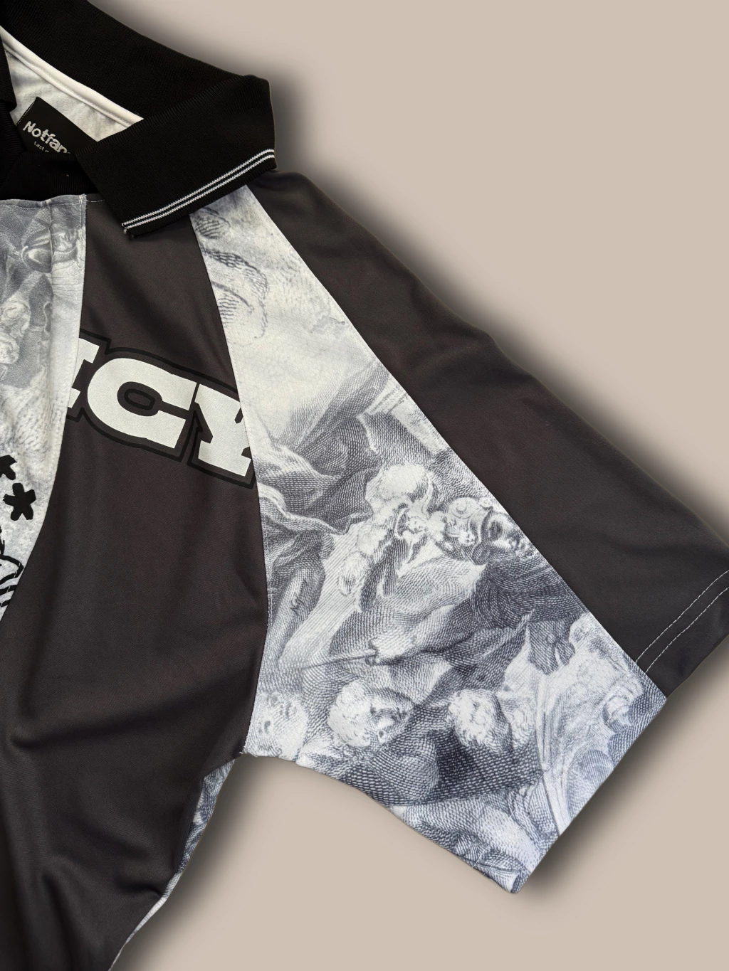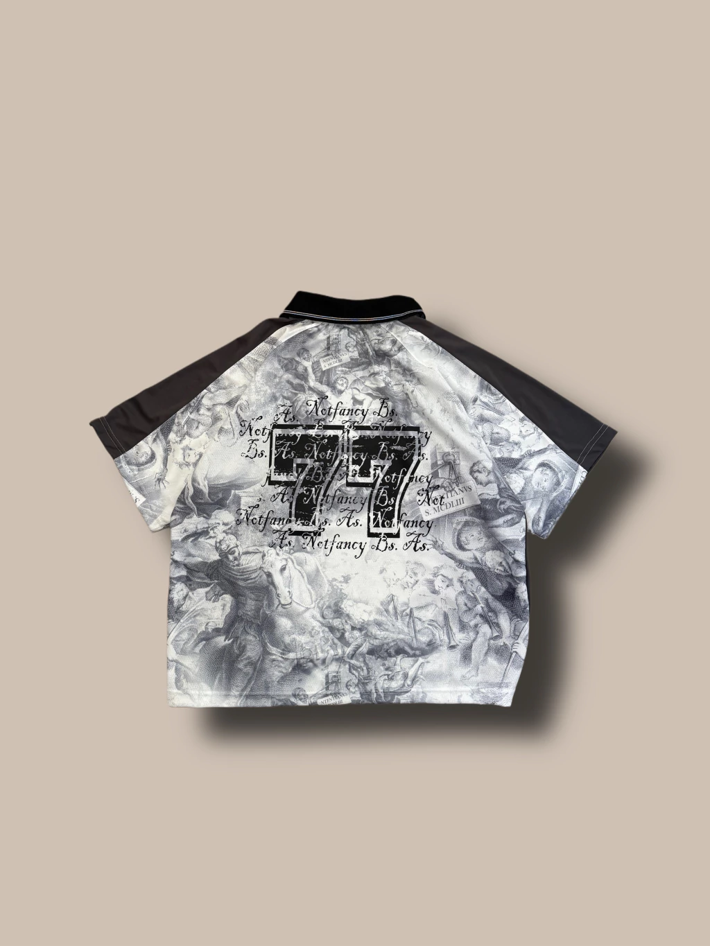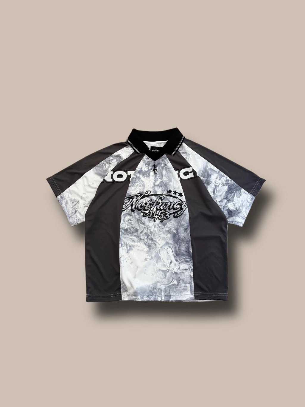Casaca tipo fulbo, combinada con gris y estampas en negro y blanco, pespunte en todas las costuras. 10 paneles componen esta prenda. Corte oversize en su justa medida. Tela deportiva dryfit sublimada.