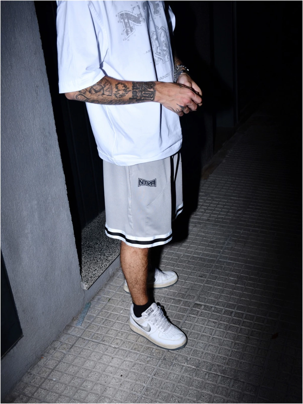 Short tipo basket. Corte oversize con recortes. Estampado y terminacion de tira. Tela tipo deportiva, pesada. El short de siempre (que no te vas a sacar en todo el verano). Respetar talle usual.