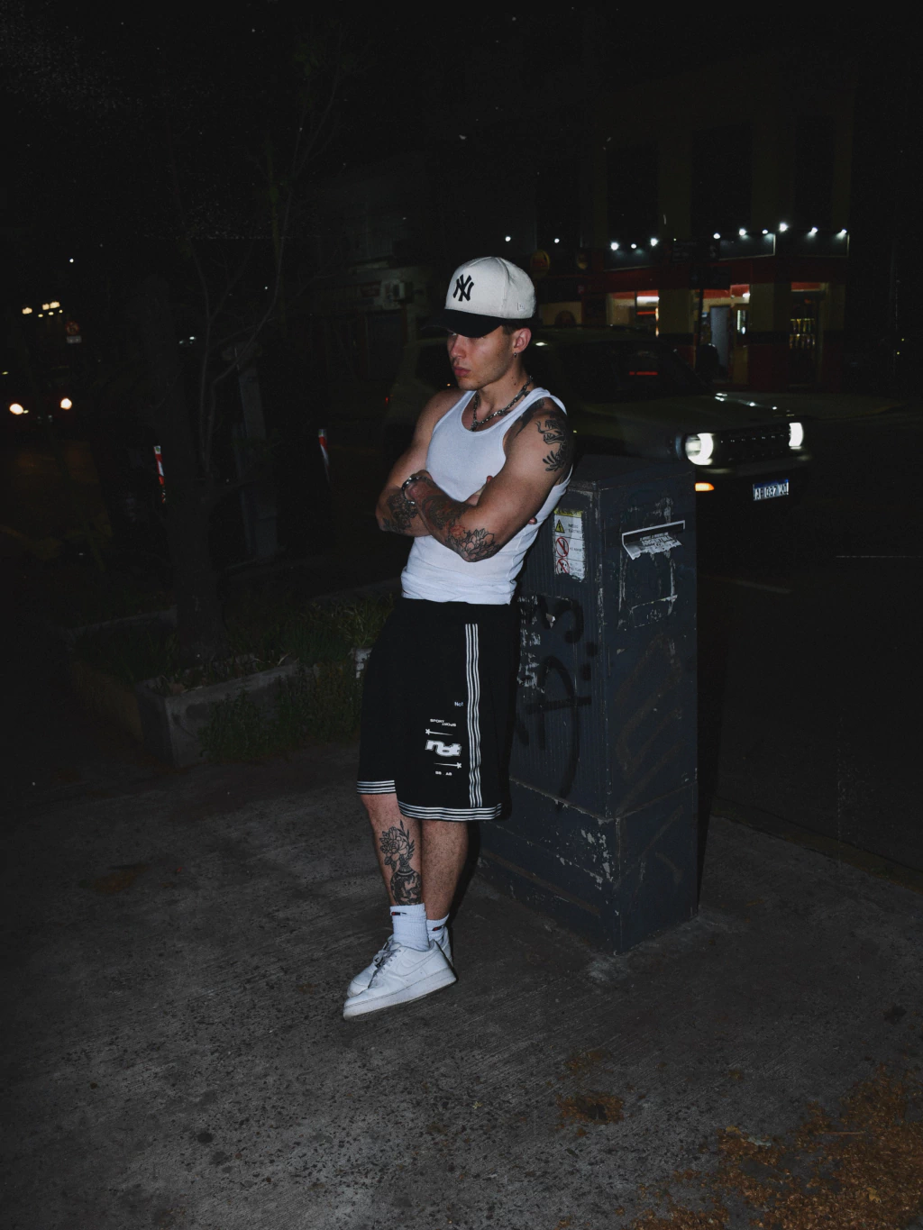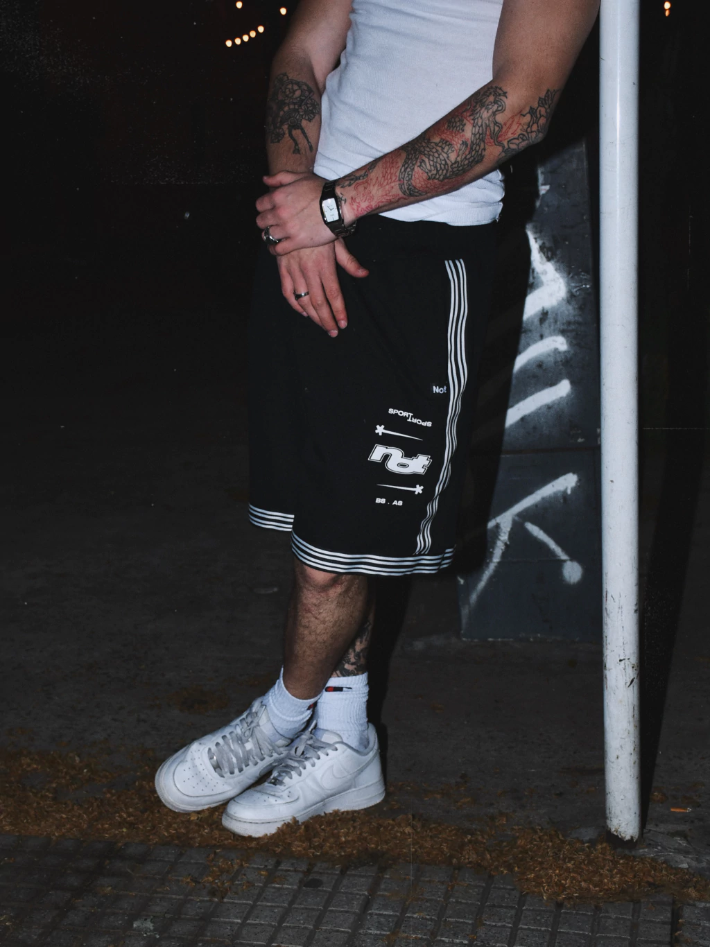 Short de tela deportiva pesada. Corte oversize justo hasta las rodillas. Estampado y tiras diseñadas por nosotros. Elastico en la cintura.