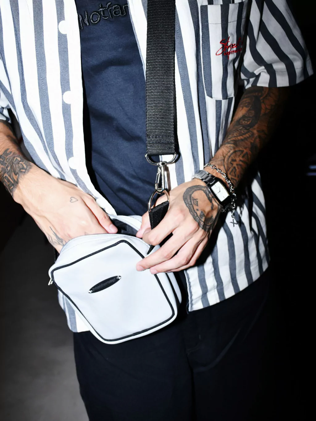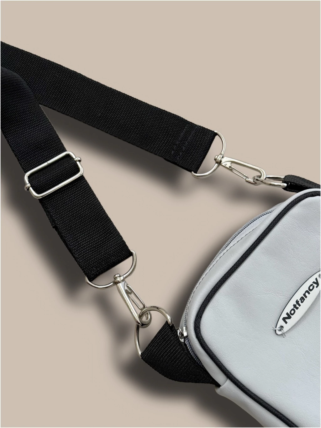 Morral simil cuero, con envivado negro. Bolsillo unico, con compartimiento interno. Herrajes de metal, correa con hebilla regulable hasta 1.10mts. Sutil.