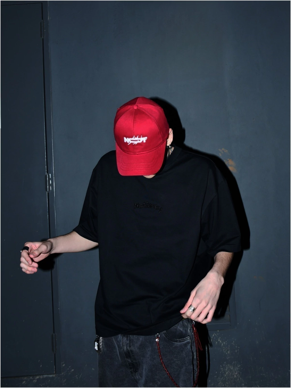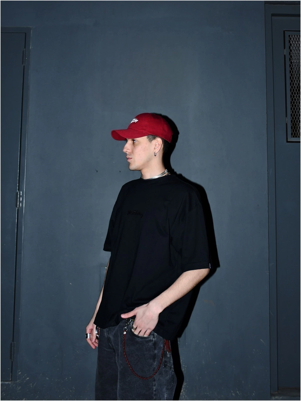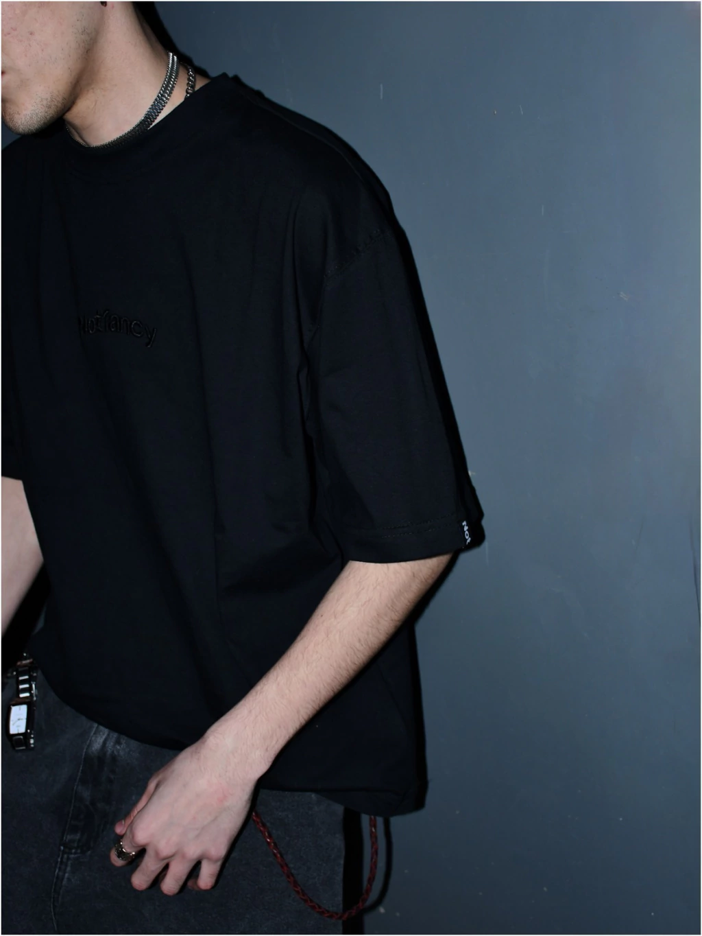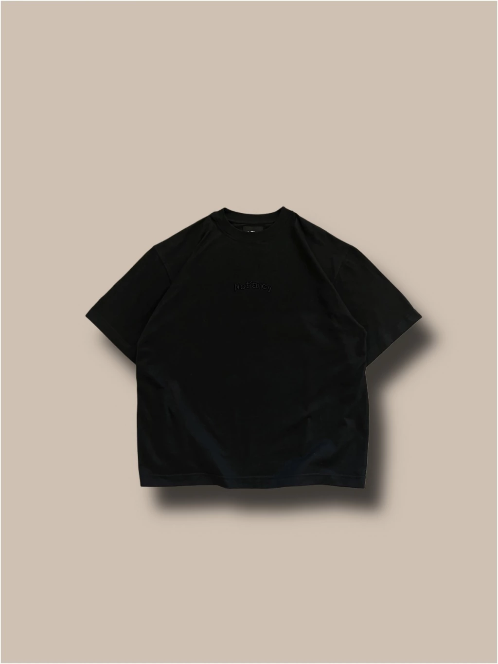 Remera negra básica bordada en relieve al tono. Corte oversize mejorado. Tela 20/1 pesada para una mejor caida. Terminaciones en pespunte. La famosa no falla.