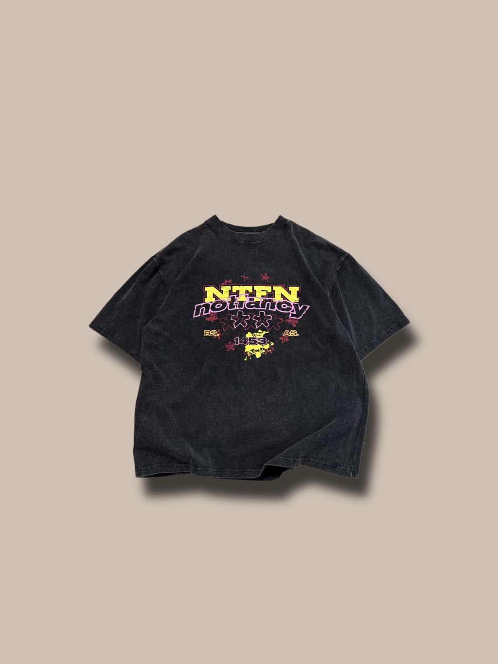 Remera color negra desgastada industrialmente, estampada con serigrafía color bordó, rosa y amarillo. Calce oversize, mas chico que nuestro corte de siempre. Tela pesada de algodón 20/1.