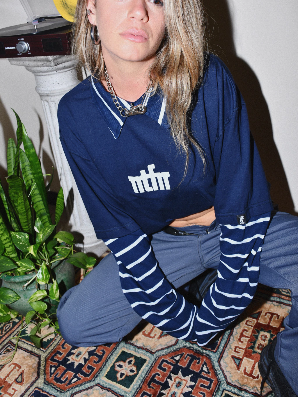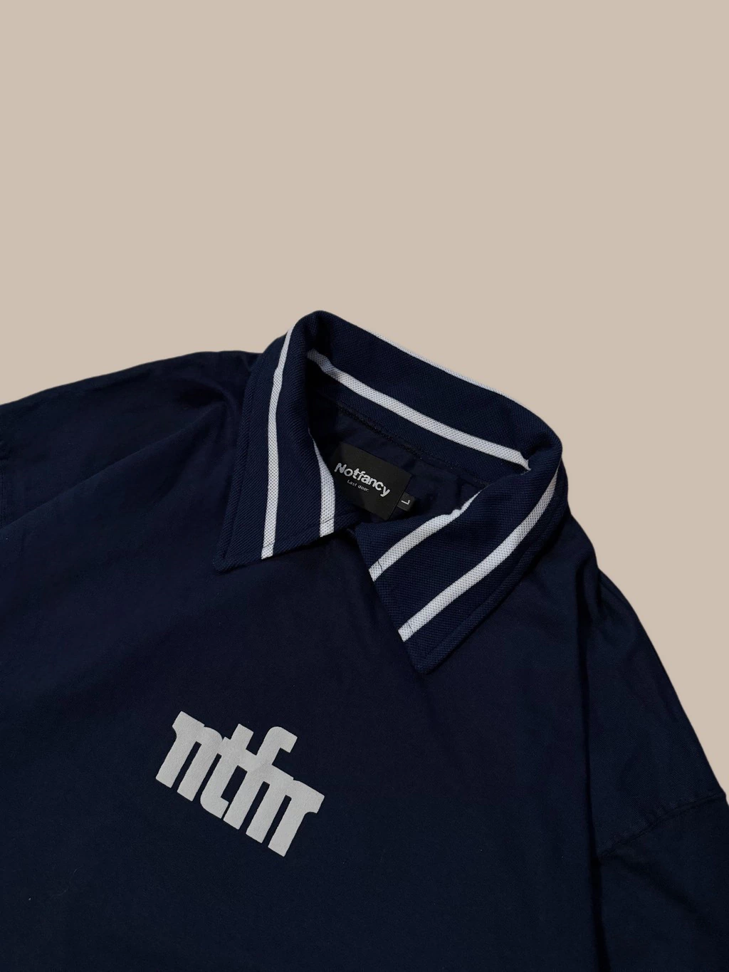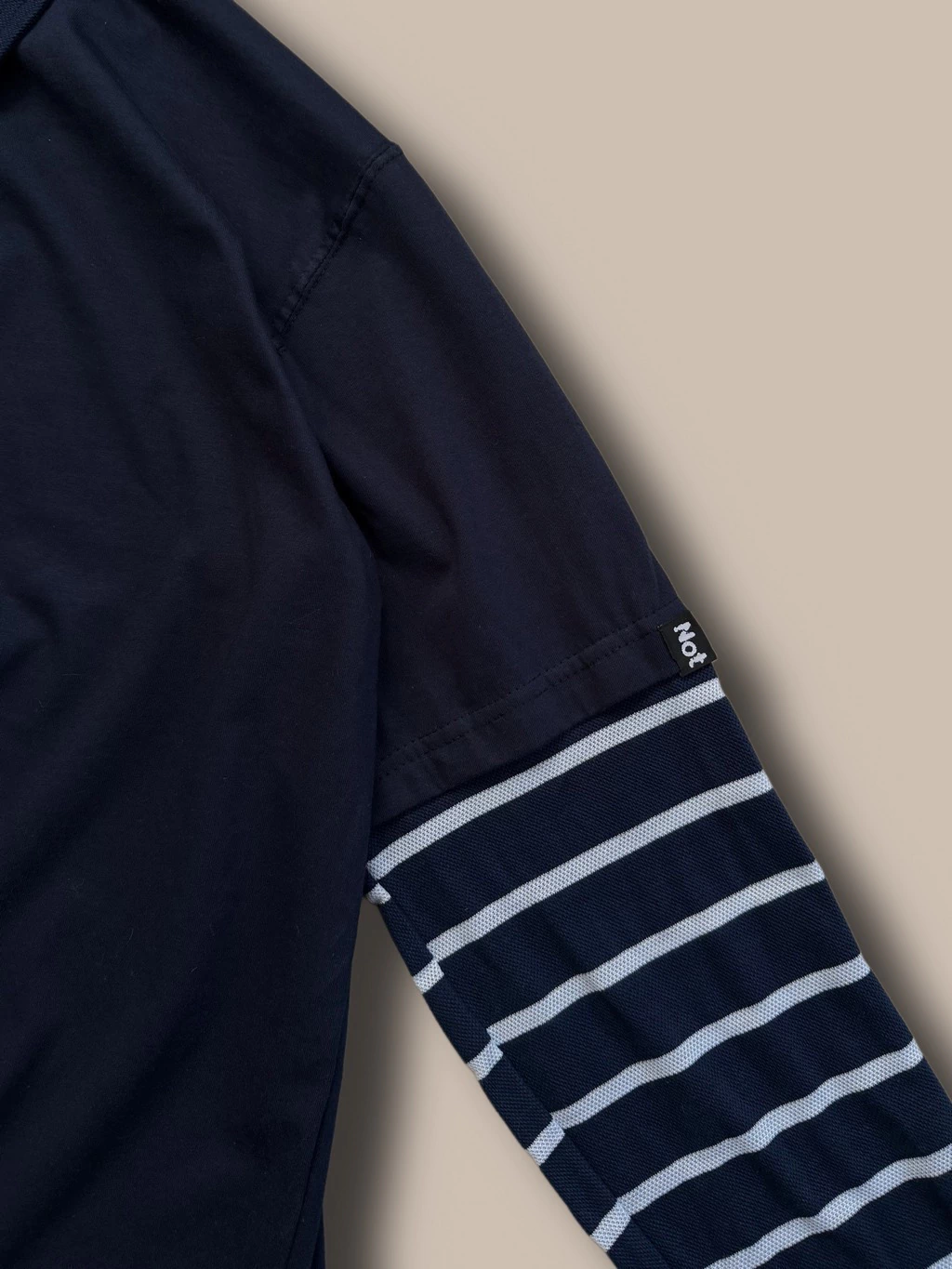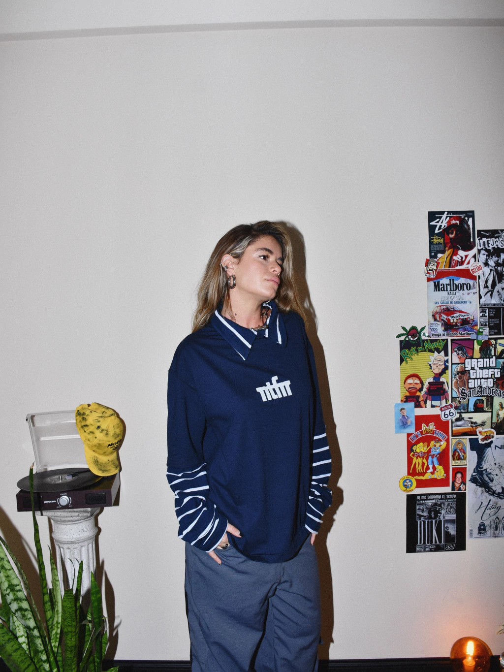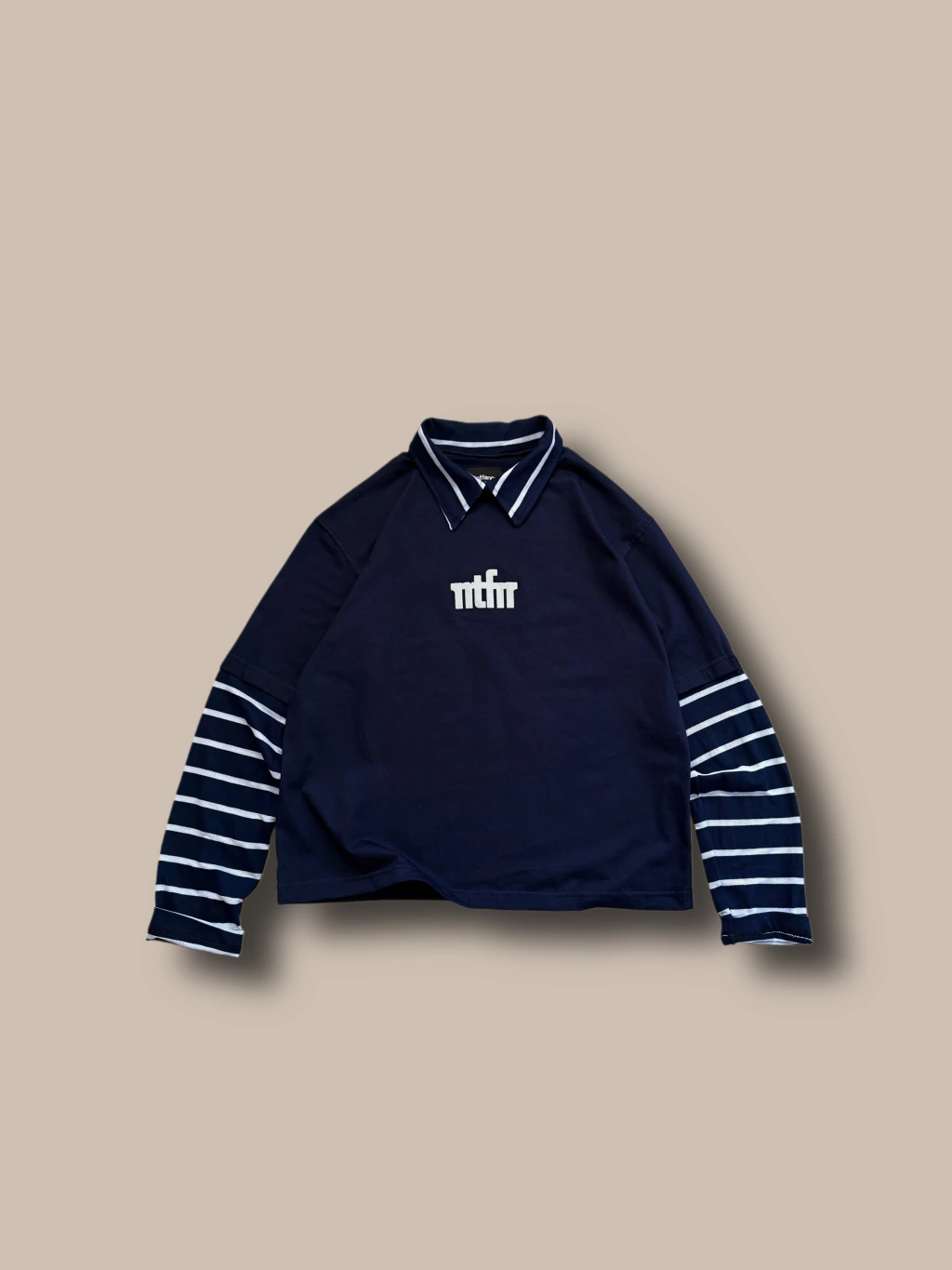 Remera manga larga de dos capas, simulando una camisa por abajo. Remera de algodon 20/1, color azul marino, tela de mangas y cuello de piqué rayado. Logo NTFN en el frente en relieve. La prenda mas indie de la colección.