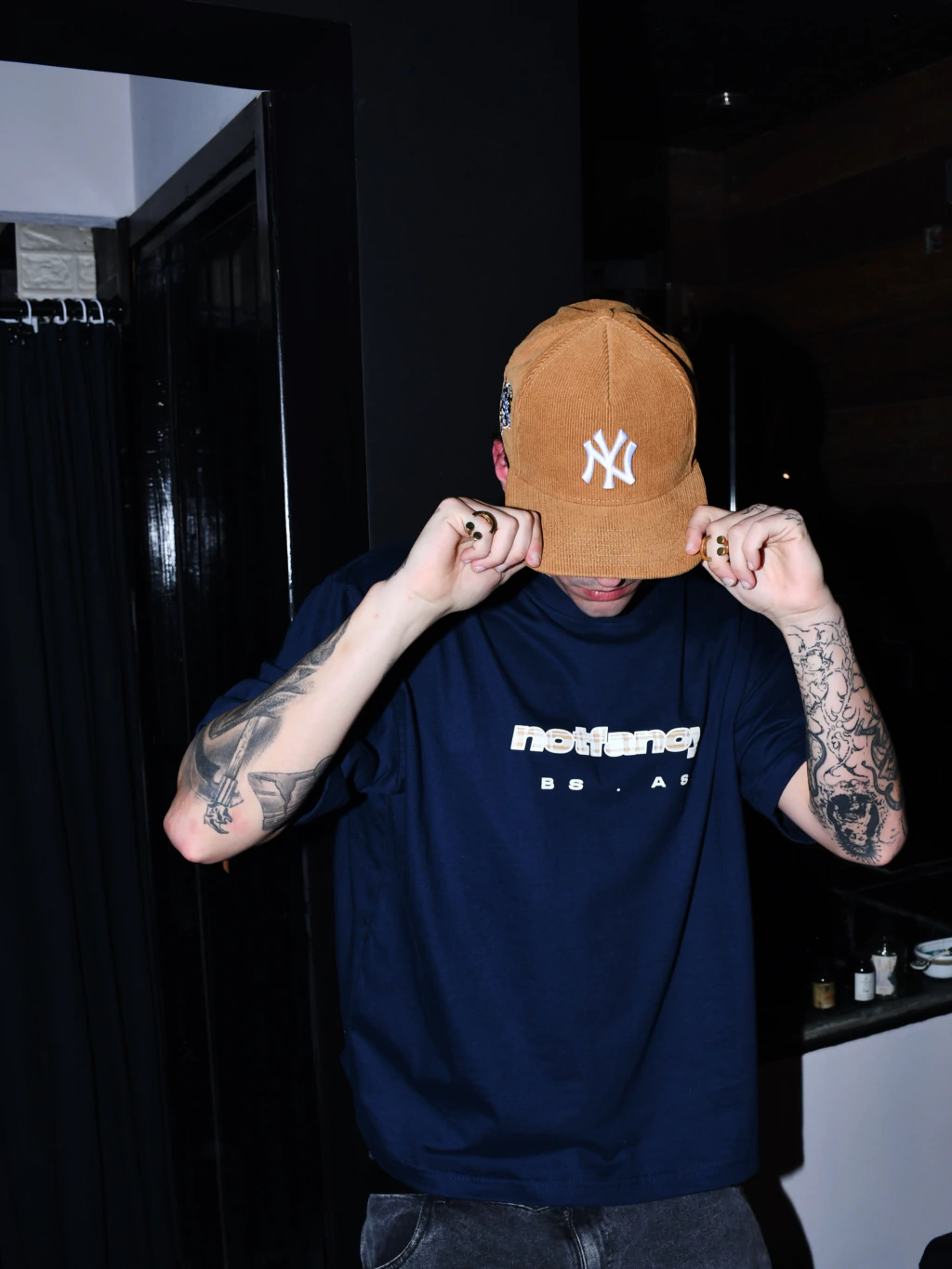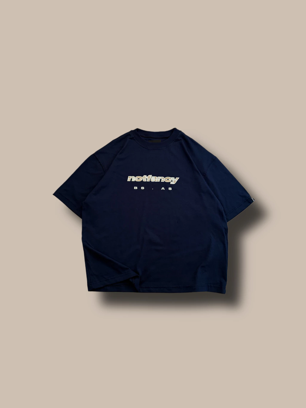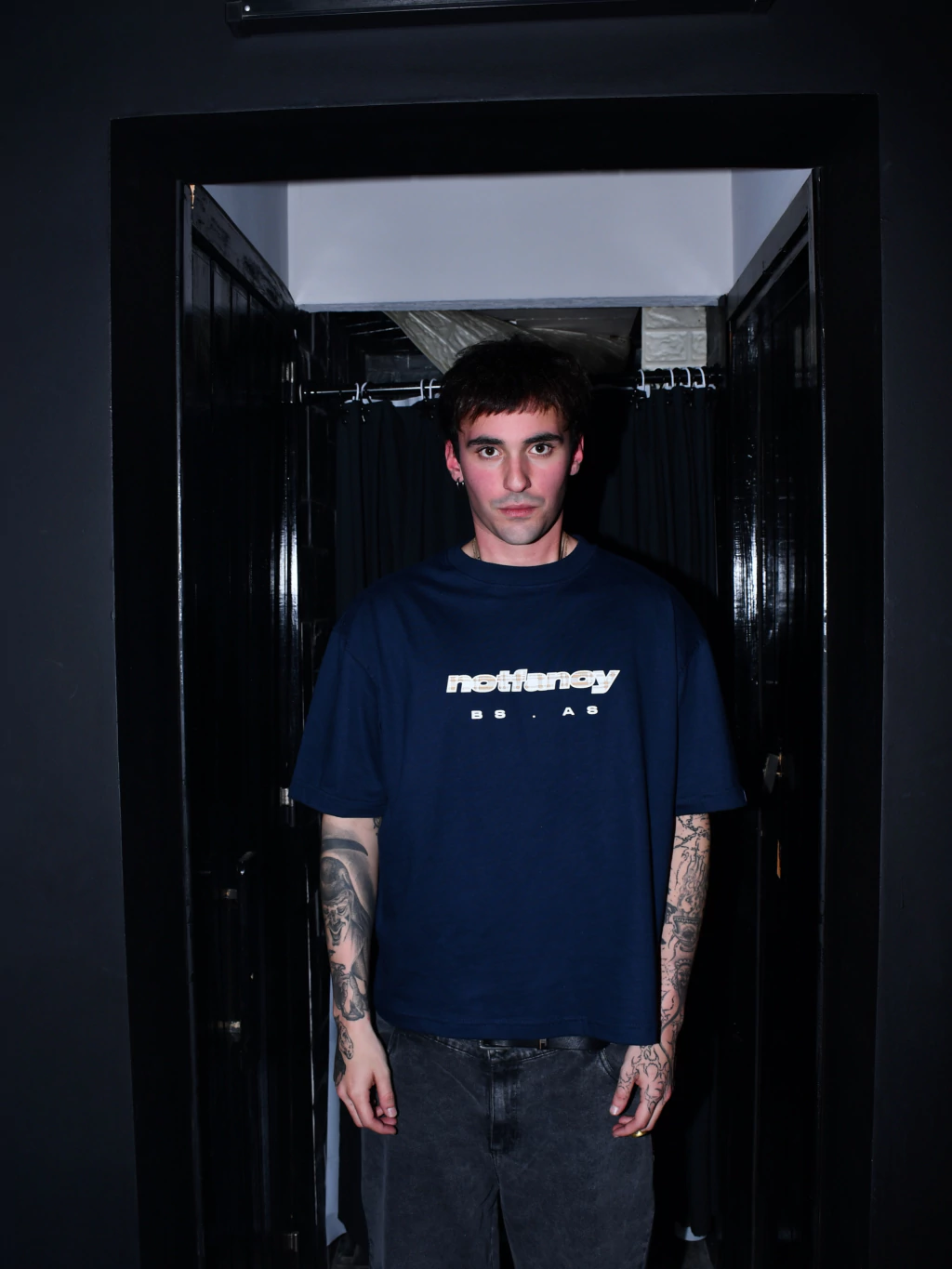 Remera azul marino, estampada a 2 colores con serigrafía. Corte oversize en su justa medida. Tela pesada de algodón 20/1.