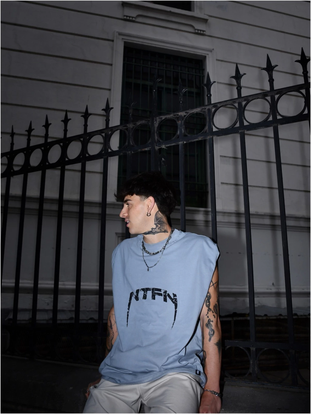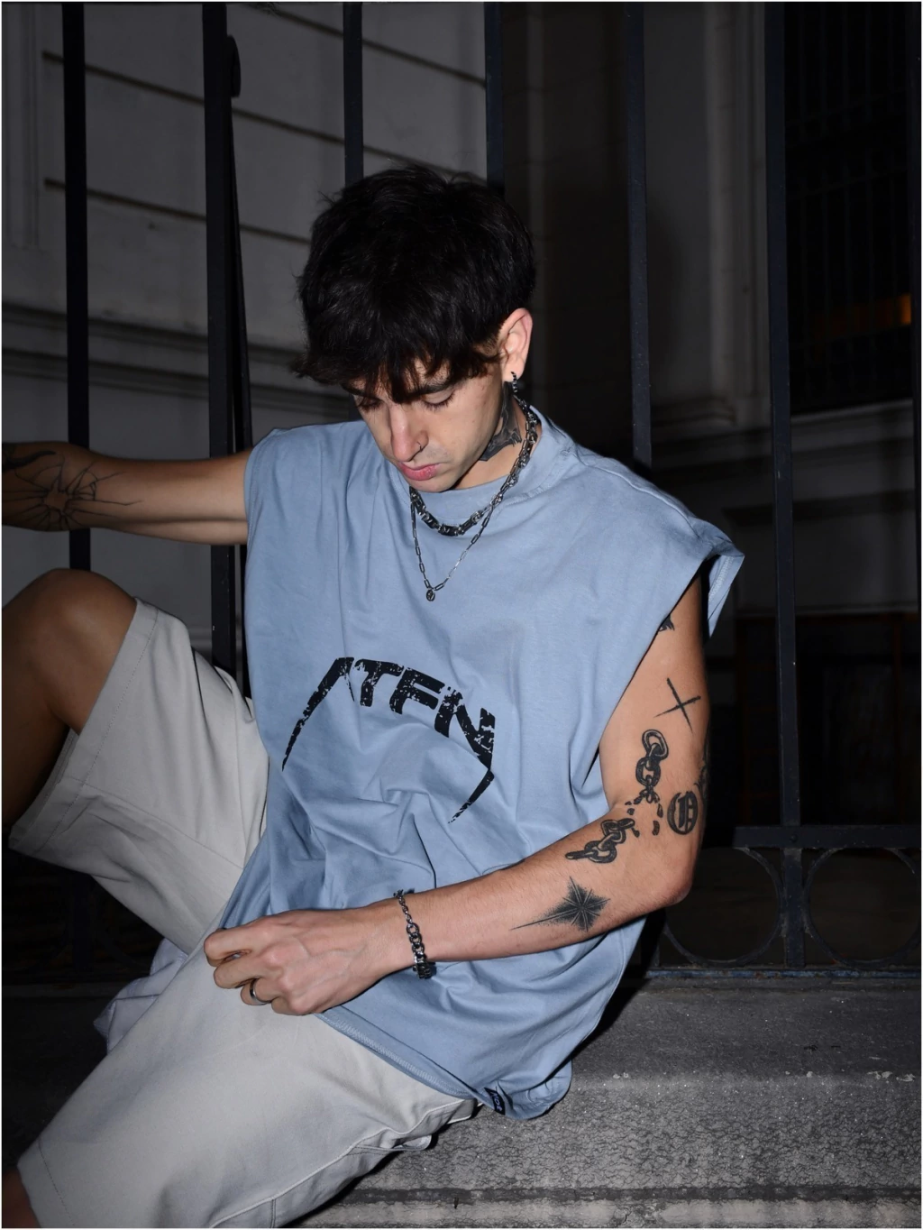 Remera sin mangas color gris clarito. Tela 24/1 no tan pesada como la que usamos normalmente, para darle mas frescura. cuello bien cerrado, estampa en serigrafia en frente y espalda.